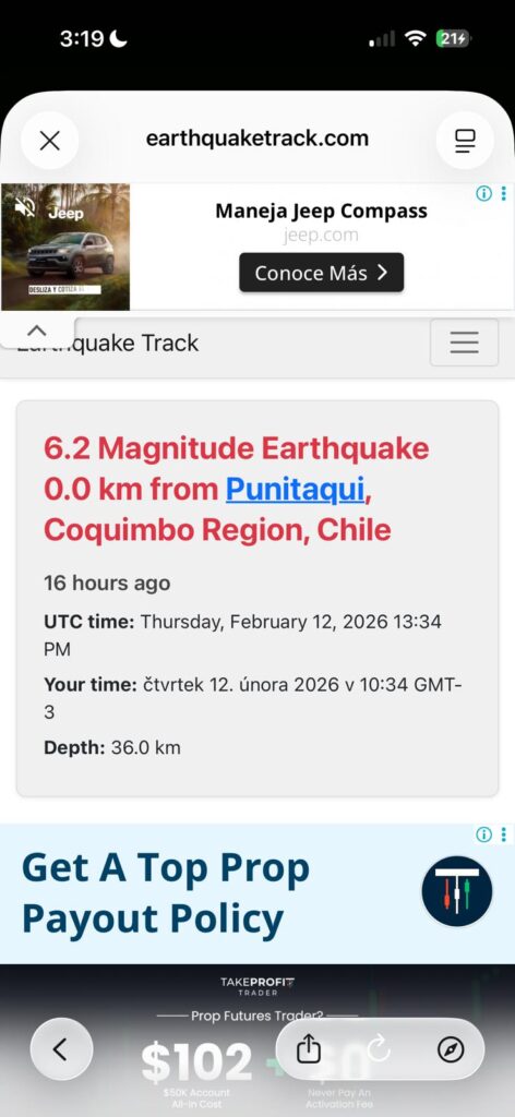 Byli jsme v Andách, blízko nejvyšší hory Aconcagua, epicentrum od nás bylo necelých 40 km. Až když nám recepční ukázala informaci seismického střediska, tak nám došlo co se stalo. Zdejší domorodci jsou na podobné jevy v této zemětřesné oblasti zvyklí a moc to s nimi ani nezamávalo.